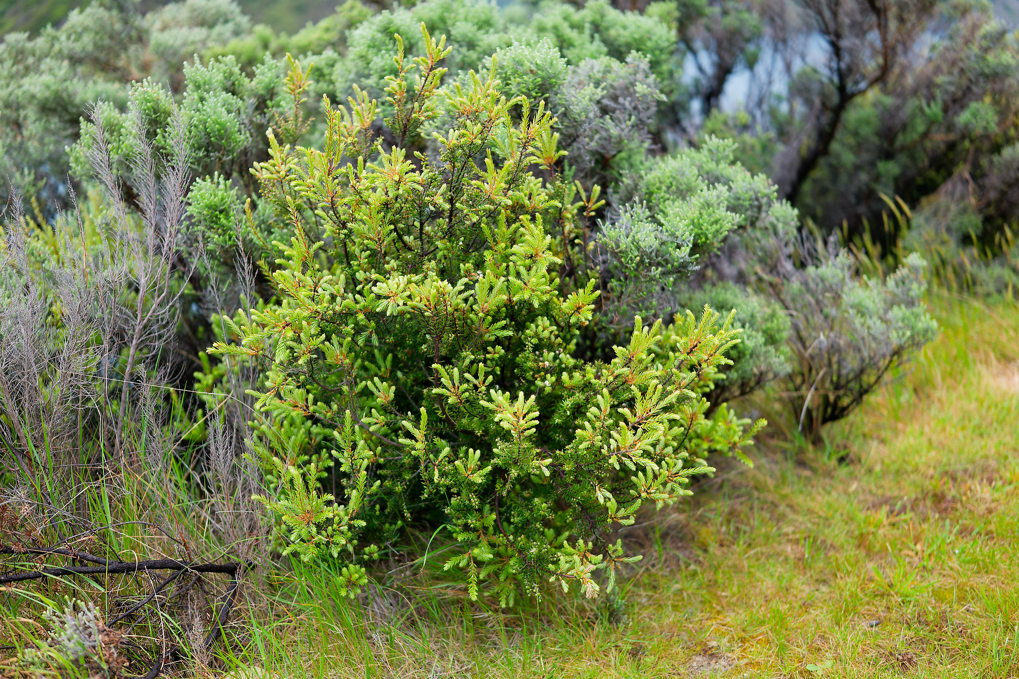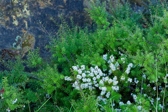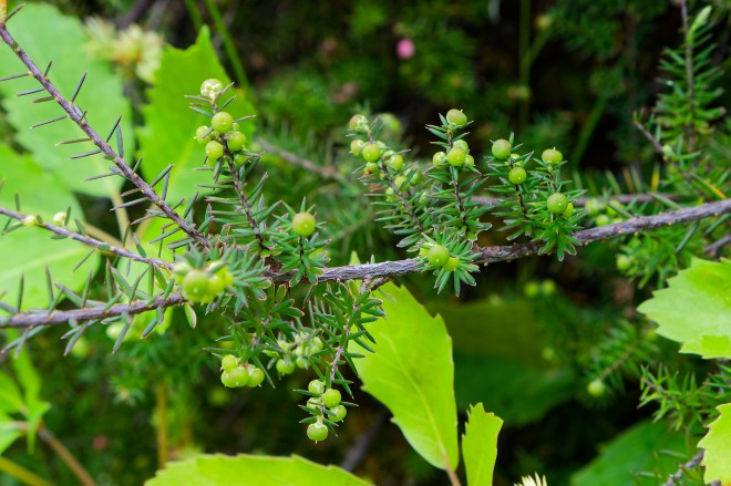 This is the pricklier of the two plants known as mingimingi on Puangiangi. It’s slightly the worse hand-hold of the two, although you know you are in trouble anyway when you are happy with a mingimingi to hold on to. This one is very common and is usually a coloniser. The other one, Leucopogon fasciculatus, seems to be more a sub-canopy shrub in the drier parts of the forest on the island. Prickly mingimingi is common throughout the country.