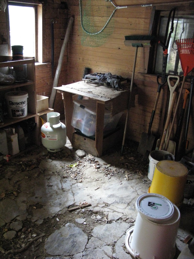 Ross was an accomplished potter but his original home-made kiln eventually collapsed. He was able to take up pottery again with the purchase of a gas-fired kiln when he got the Pension, which I expect would have provided quite an income bump. The newer kiln sits under a mussel float a few metres from the earlier one. I can’t get my head around the gas-fired one; perhaps some critical parts are now missing, but at least penguins like to nest underneath it. His pottery wheel was unfortunately outside when we arrived in 2012 and was beyond saving. Inside are some nice items that he has made and inscribed. He gave a nice pot to friends, who after more than 20 years have now given it back to the island where it sits with the others. Near the kilns is a puddle mill, again housed under a mussel float, used for processing the clay he dug on the island. The shed held a hundred or more lumps of fired clay, which we think were test firings to identify the best sources. I know where one such source was. I fell into it. It took a bit to disentangle myself, the backpack sprayer I was carrying, climb out and regain dignity.