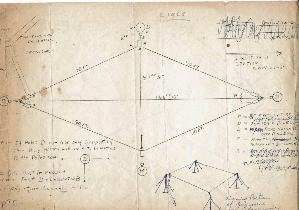 Ross had electric light at the new house, from a small solar panel. When we arrived there was also a newer panel and two batteries. They staggered on long enough for us to get a bit of light while we arranged for a new system. We found no fewer than five little TVs in the shed and Ross was obviously an enthusiastic adopter of the new broadcast medium when it came to the district. Above is a plan for the diamond-shaped aerial set out on the hillside, not in Ross’ hand apart from the date annotation. Many farmers nearby would have had a similar arrangement and no doubt notes were compared as to who had the best set-up. The posts are still there but we had to remove the wires if we were to use helicopters nearby.