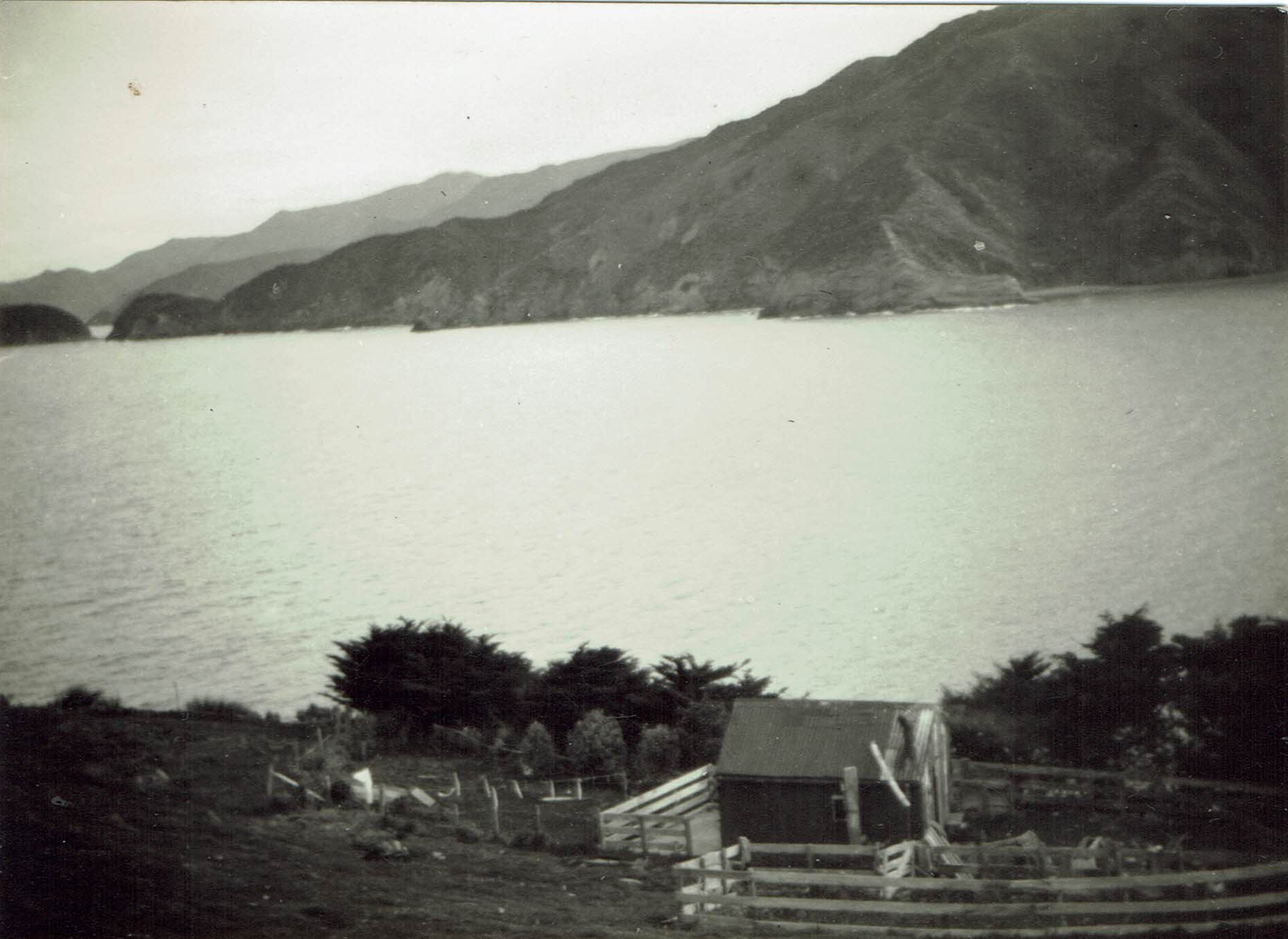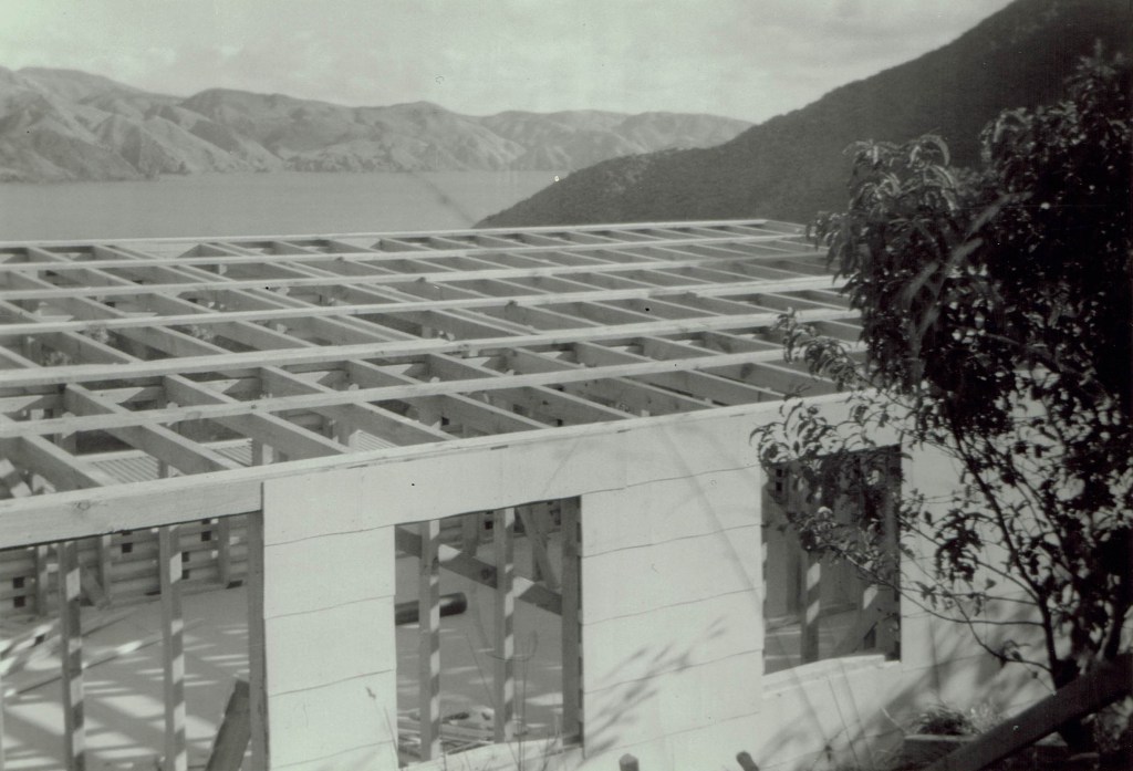 The fireplace is made from bricks that Ross made on site, and one is dated 1979, with Ross’ name on it. The outer is mortared/concreted stone and there is a piece of argillite incorporated as a feature. Perhaps the fireplace was a later addition, or indeed maybe the house took ten years to finish off. He built a 1500-litre water tank behind the house, which was plumbed for a cold supply. Water was heated with a succession of pot bellies or Thermette-like devices, and the bath was connected to a wetback off the fireplace. In later years Sue Keall recalls the bath being used mainly for storage. There is an inside flush lavatory connected to a home-made concrete septic tank. Ross ran short of water in summer and would go over to a water source on D’Urville to fill up when required.
