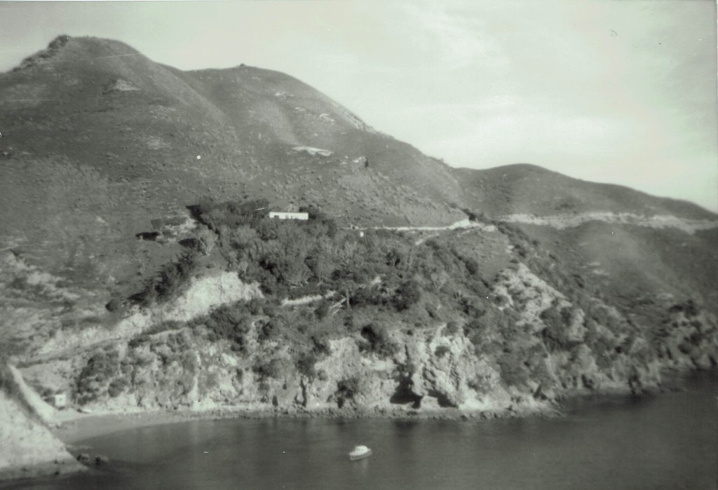 Ross had lived in what became the woolshed for a few years, but he moved north and built a three-roomed house and long-drop outhouse (which was just standing in 2012) above the northerly landing beach. Actually Ross said it was two rooms with a third added later, but I can’t see the join or any variation in building materials and so doubted him. However, if you squint at the photo above you will see only two windows on the seaward side. The present building has three. Ross was right! He chose the site very carefully and it is a lot less windy than many other places he could have picked. If you scroll down, you will see a 1970 photo Ross took from the same spot, showing the main track on the island and one down to the beach. These are not present in the 1961 photo and I surmise that Ross carted the building materials by hand for the first house he built.