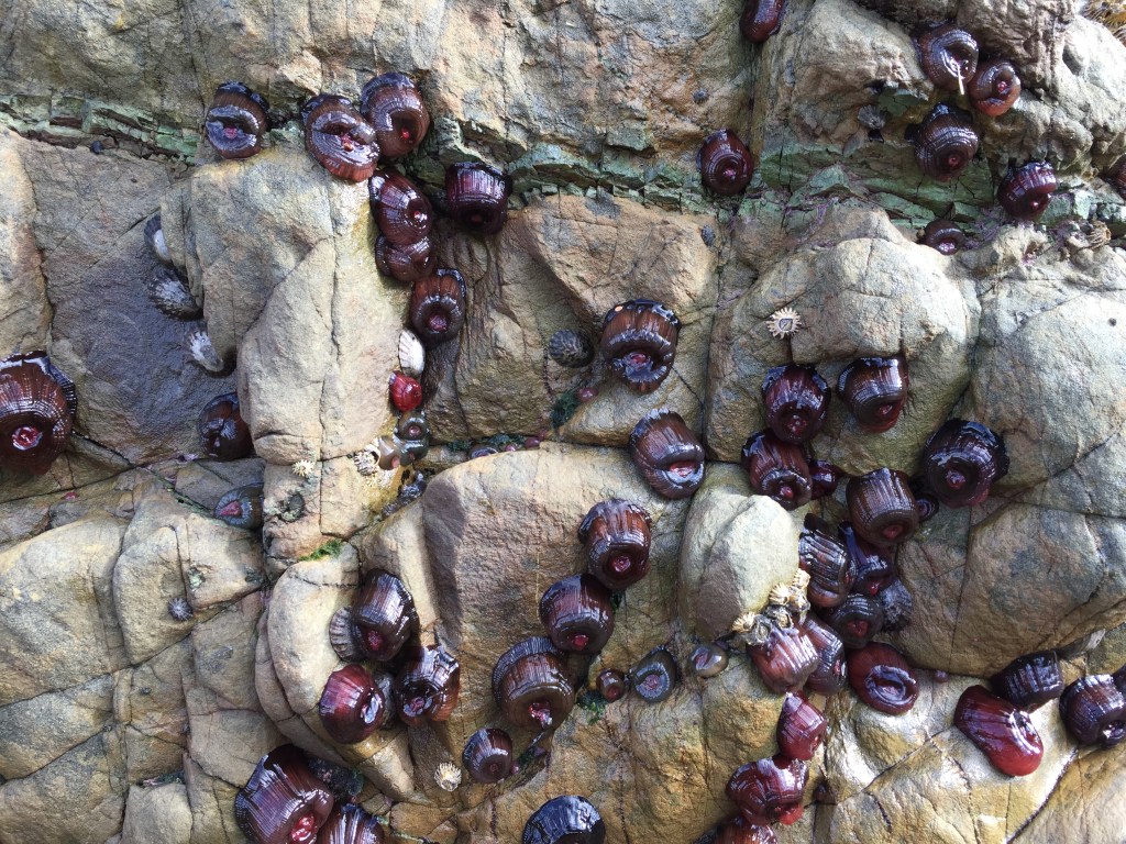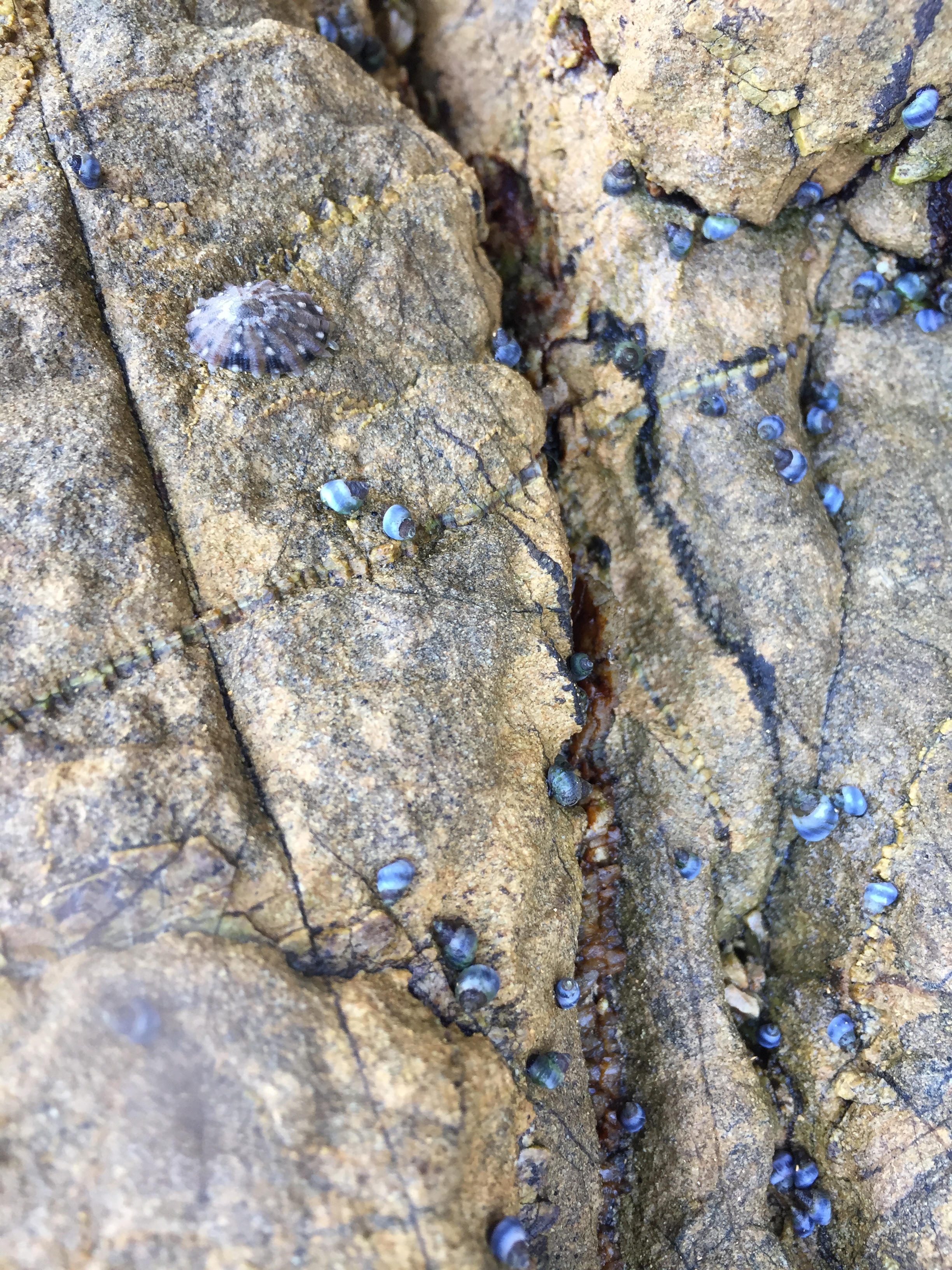 The substratum at HW (as measured in relation to strandlines on the beaches) and down for the first 0.3 m has few visible organisms except two species of tiny periwinkle: the abundant blue-banded Austrolittorina antipodum and the less common brown A. cincta, followed by the snakeskin chiton Sypharochiton pelliserpensis. The highest barnacle on the shore is Epopella plicata, and the large limpet of the middle and upper shore, Cellana denticulata, is conspicuous by its size and high-pitched shell if not by numbers. The barnacles grow individually and in small clusters but cover only a fraction of available space and are too few by far to form a distinct barnacle zone as seen on similar shores in northern NZ. Distribution of the modest barnacle Elminius modestus is patchy and lower on the shore.