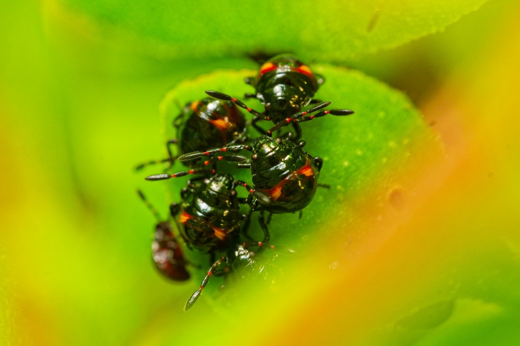 This cluster of tiny (2 mm) bugs was on a leaf of Tetragona. I disturbed them accidentally, but they reconvened on the same leaf very quickly. They were such a contrast with their shiny black against the fresh light green of the native spinach leaf.