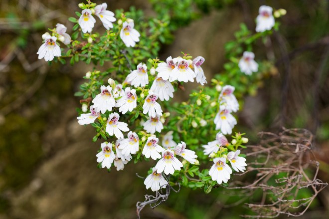 This sub-shrub is found throughout the North Island, into the Marlborough Sounds and pops up at Lake Ellesmere. It’s a root parasite but does photosynthesise for itself also. Euphrasias are very difficult to grow but this one is said to be the easiest of them.