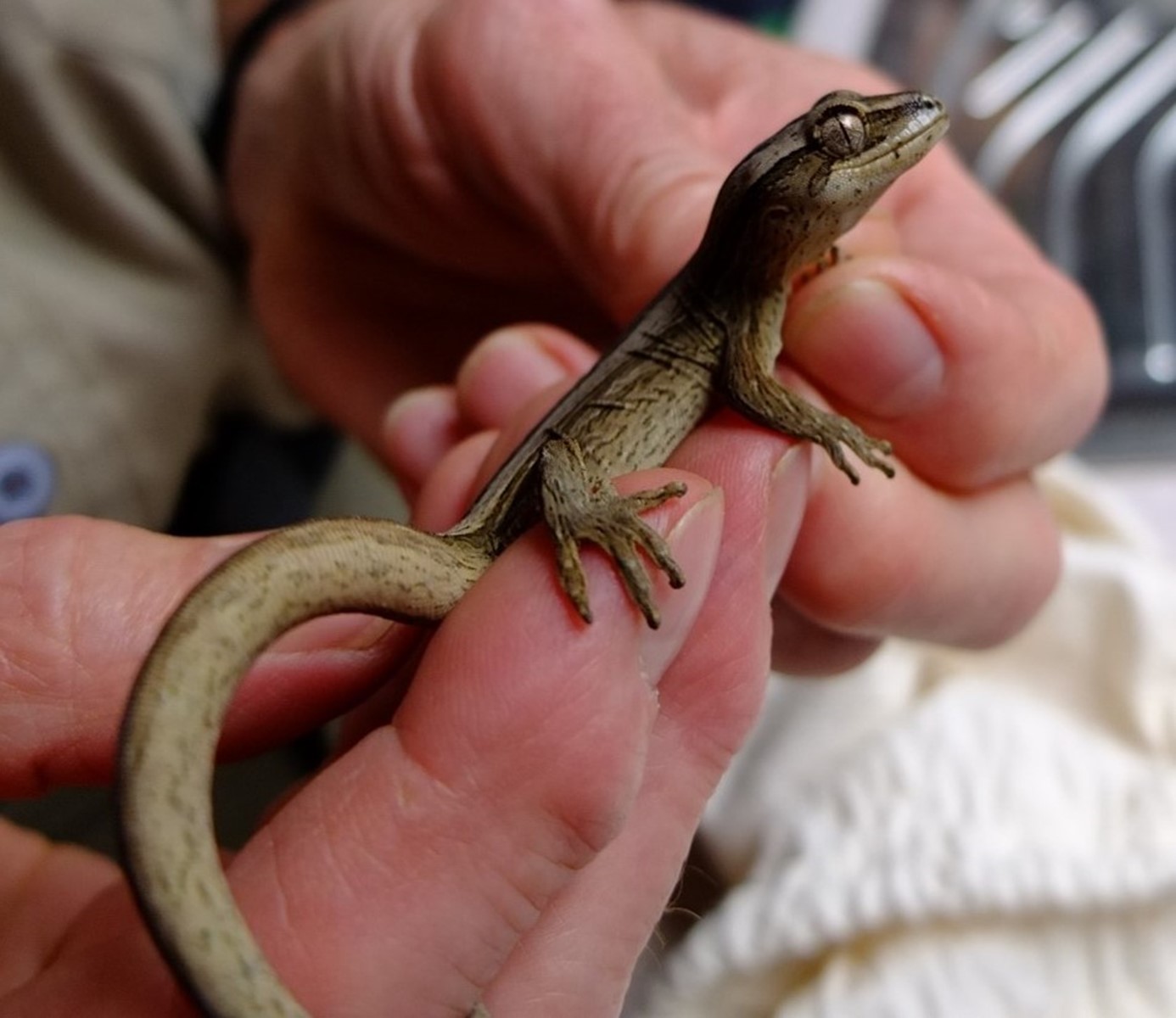 One evening Lynn rang me and said they had found something significant, and demanded that I guess. I immediately suggested that they had found spotted skink (Oligosoma lineoocellatum), which turned out to be right and they all thought I was very brainy. Lynn doesn’t know that Peter and I had already considered that spotted skink ought to be there and it was probably just a matter of the people with time and the right identification skills showing up. My reputation won’t be punctured by putting this on the internet because that is a great place to keep secrets. After finding the first spotted skink, the team quickly found more and have concluded that it is at least moderately abundant.