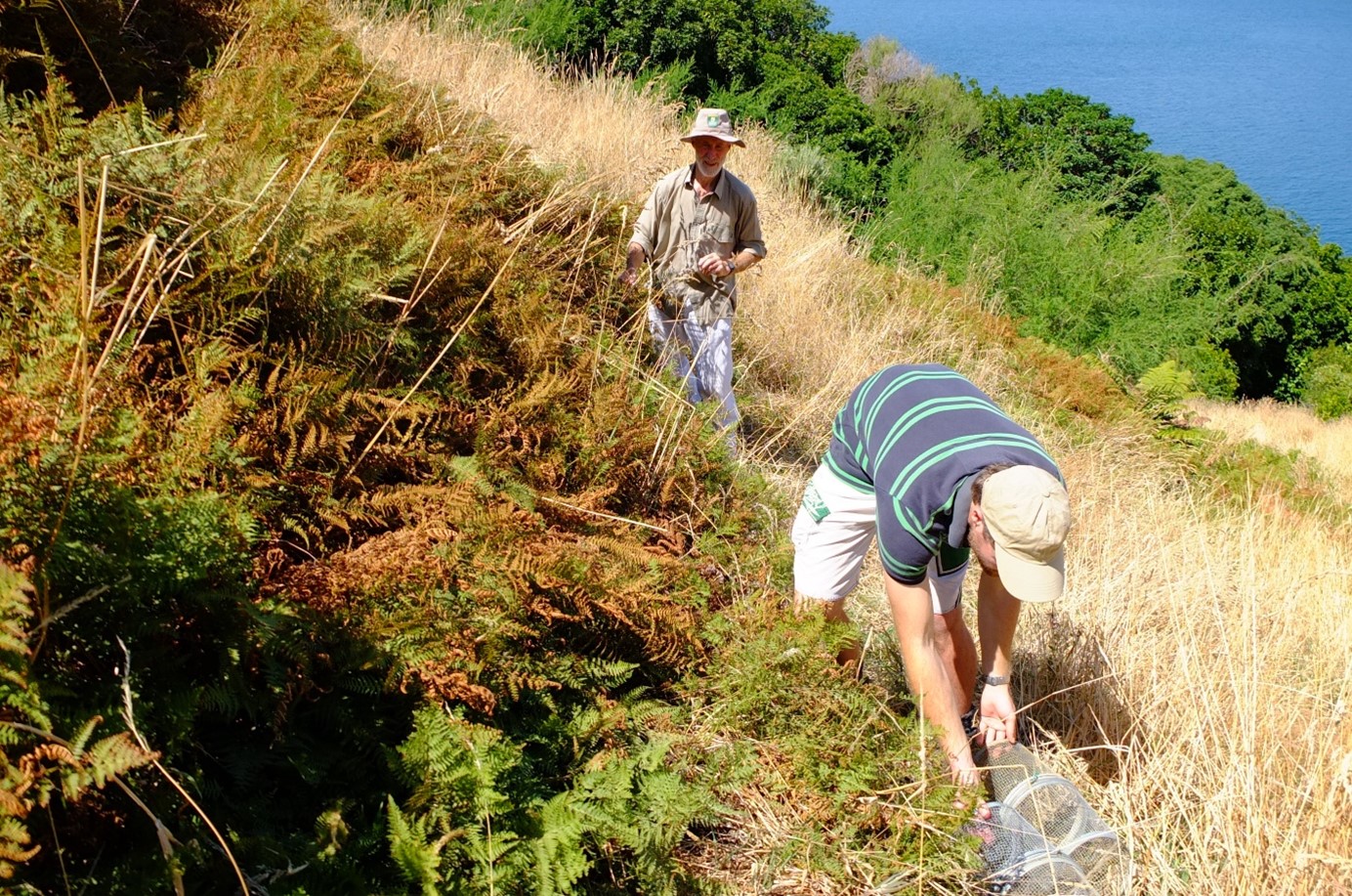 Meanwhile, over on Te Pakeka a large team led by Les Moran was catching striped gecko, initially for disease screening and then for transfer. They caught them using Gee’s minnow traps, another trap made from mesh wastepaper bins and plastic funnels, and by hand.