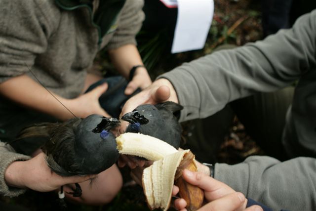 In August/September 2007 a DOC and volunteer catching team mist-netted ten kokako at the Otamatuna Mainland Island area of Te Urewera. Kokako are robust and stoic birds and they were able to cope with being held in an on-site aviary while disease screening was completed. They also dealt with the switch to an unfamiliar, albeit appetising, diet of jam in water, dry bird mix, banana, grapes, oranges, and waxmoth larvae as well as natural vegetation.