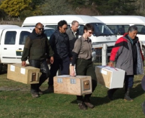 Once the holding period was complete, the logistics team battled falling snow, and even a broken leg sustained by a member of the catching team, to get the birds choppered over to Boundary Stream and released. All ten were carrying transmitters and were monitored for as long as the signals were being received. Transmitter harnesses were set up to fall off easily, and ongoing monitoring will rely on sightings and reading of colour band combinations.